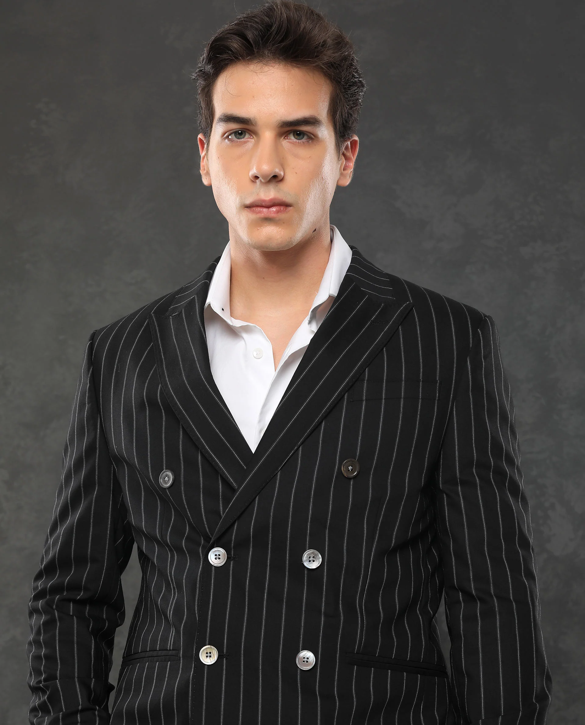 SELF STRIP DOUBLE BREASTED SUITS GUILD STATEMENT TAZY – BLACK